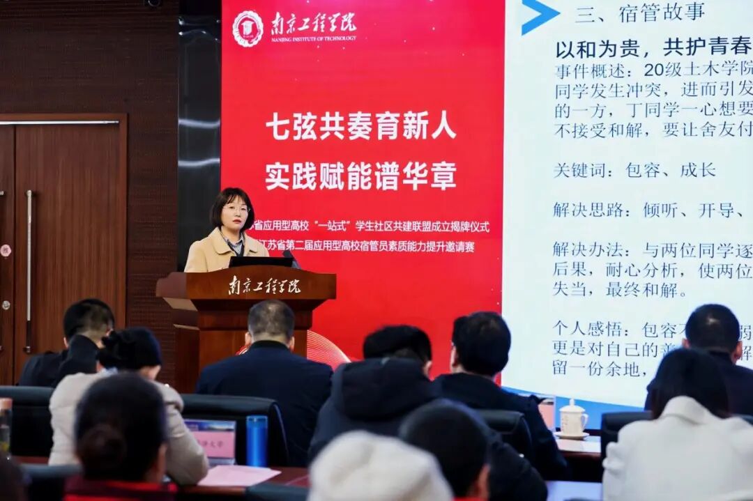近日,江苏省应用型高校“一站式”学生社区共建联盟成立大会暨第二届高校宿管员素质能力提升邀请赛在南京工程学院举办。我校宿管员郭秀娟代表学校参赛并荣获二等奖,充分展现了我校宿管队伍的能力素养与专业风采。