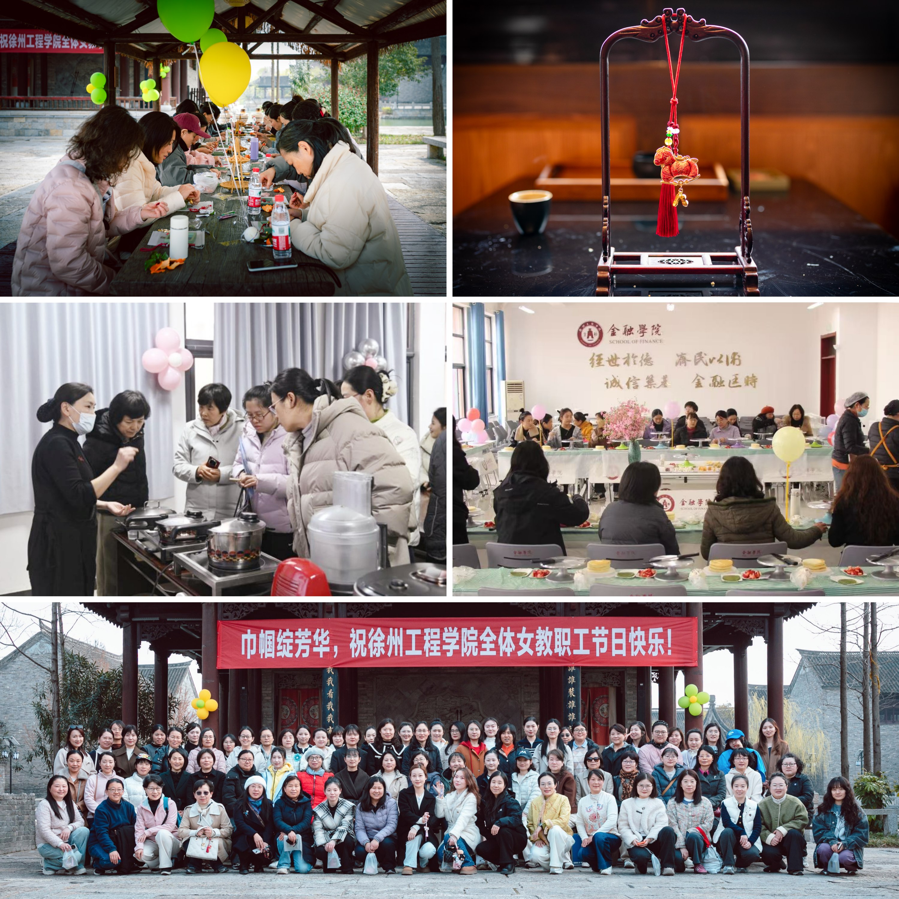 活动中,女教职工们沉浸式领略水墨苏北的独特风光,曲巷回廊、碧瓦红墙的江南景致让大家身心舒畅。在茶文化体验环节,温杯、洗茶、冲泡……大家围坐一起静心聆听、倾心交流,在清幽茶香中洗去日常工作与生活的浮躁,寻回时间本真的节奏,也进一步拉近了彼此间的距离。在宋锦挂坠手工制作环节,女教职工们兴致勃勃地动手创作,将巧思与心意融入每一个制作步骤,一件件独具特色的宋锦挂坠相继完成。大家在慢节奏的手作中舒缓身心,感受非遗文化的魅力。