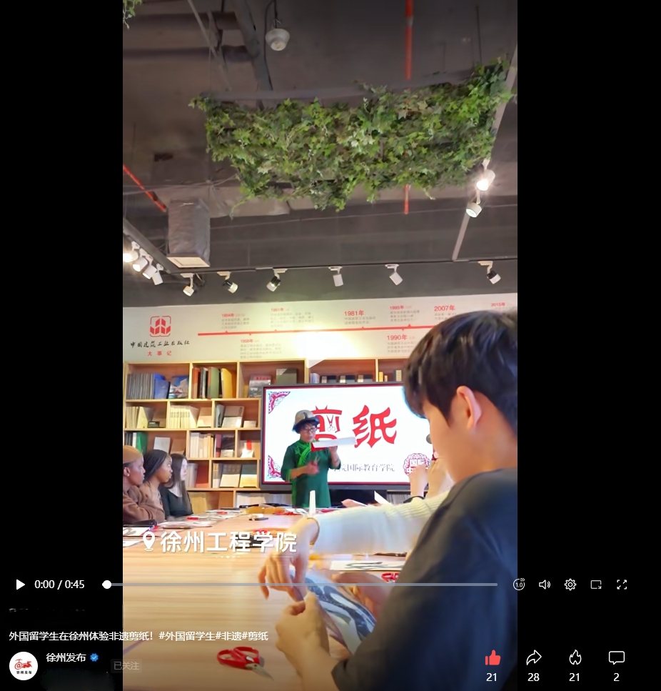 4月8日,《徐州日报》与“徐州发布”分别报道了我校留学生体验非遗剪纸活动。