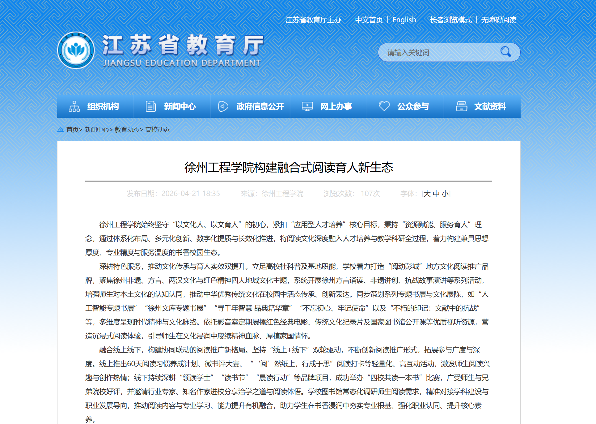 值世界读书日来临之际,4月21日,江苏省教育厅官网以《徐州工程学院构建融合式阅读育人新生态》为题,报道了我校阅读推广工作的创新实践与显著成效。