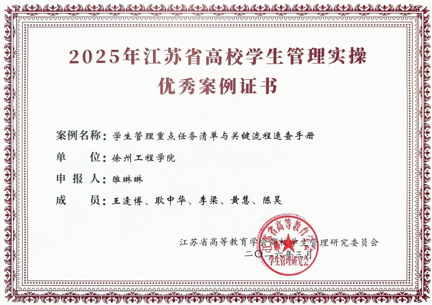 近日,2025年江苏省高校学生管理实操优秀案例评选结果揭晓。我校学生工作处报送的案例《学生管理重点任务清单与关键流程速查手册》,凭借创新突出、务实管用、推广性强的优势,在全省众多高校参评项目中脱颖而出,成功获评江苏省高校学生管理实操优秀案例。